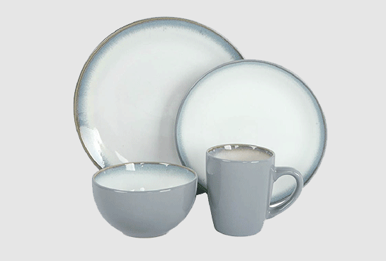 Vajilla con un suave barnizado con forma de gres a lo largo de cada pieza. Cuenta con un atractivo aspecto moderno, facil de usar, hecho de gres resistente. En dos colores distintos Celeste y Gris.